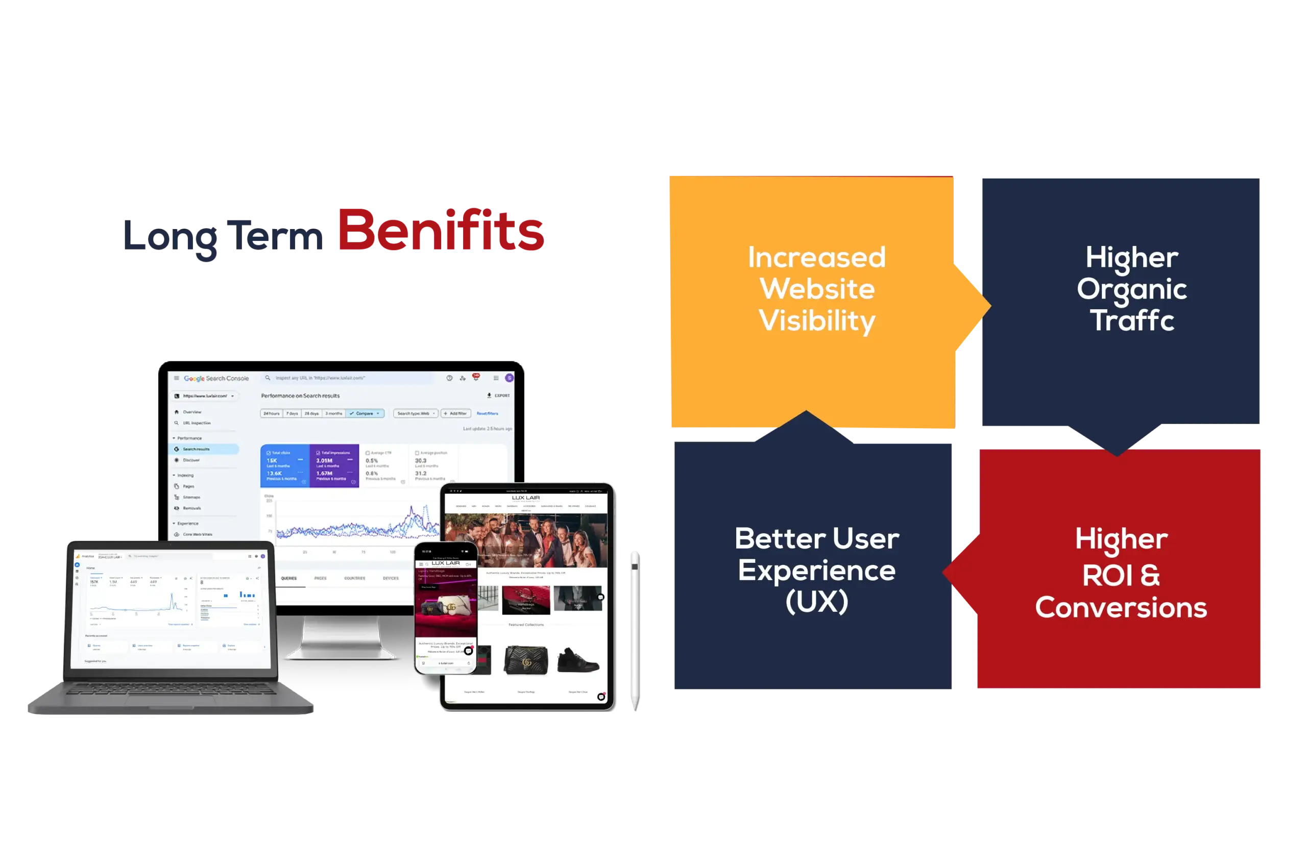 Our SEO services expand your site’s reach, get qualified traffic, and improve conversions. We make sure that the majority of visitors to your website are converted into customers by consolidating your site with search engine algorithms. We aim for measurable results, including higher revenue, better engagement, and increased ROI.